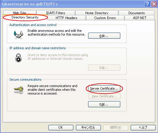右クリックメニューバーより [ 操作 ] → [ プロパティ ] をクリックしてください。 - [ ディレクトリ セキュリティ ] タブを選択してください。