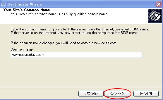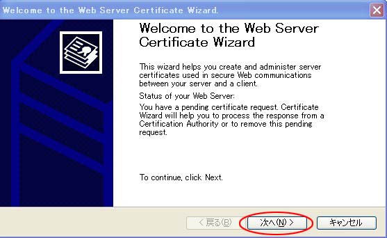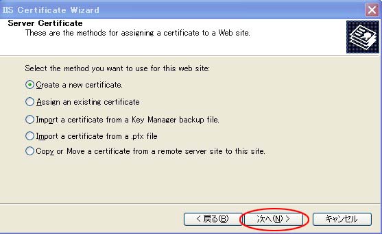 - サーバ証明書ウィザード [ 証明書の新規作成 ] を選択して、[ 次へ ] をクリックしてください。