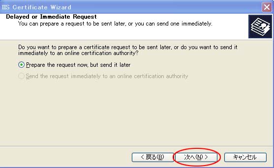 - [ 証明書の要求を作成して後で送信する ] を選択して、[ 次へ ] をクリックしてください。