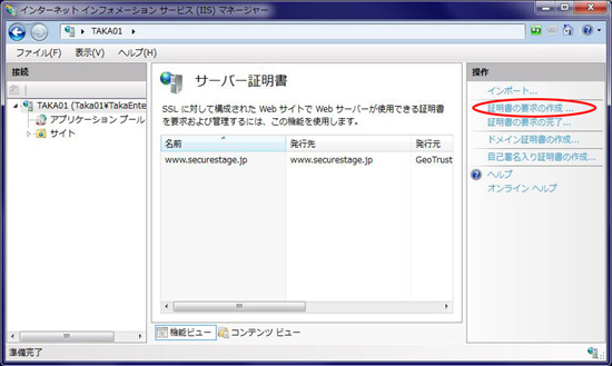 - 右のメニューから [ 証明書の要求の作成 ] をクリックしてください。