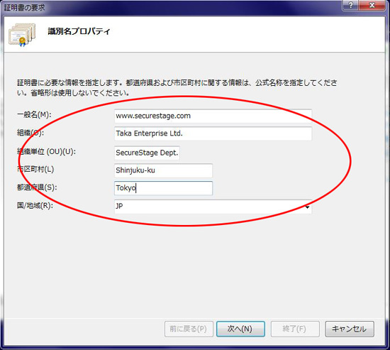 Organization 会社名・組織名を入力してください。 Taka Enterprise Ltd Organization Unit 部署名を入力してください。 Technology City or Locality 市区町村を入力してください。 Nakano-ku State or Province 都道府県を入力してください。 Tokyo