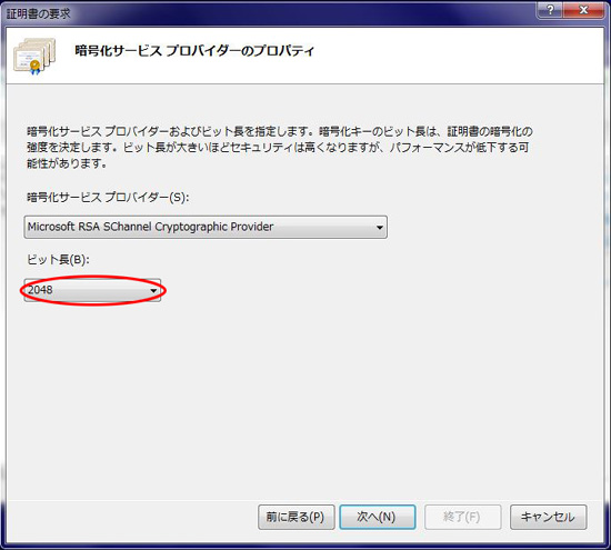 日本は「JP」です。JP - 次の画面にて [ Microsoft RSA SChannel Cryptography Provider ] と [ 2048ビット ] を選択してください。