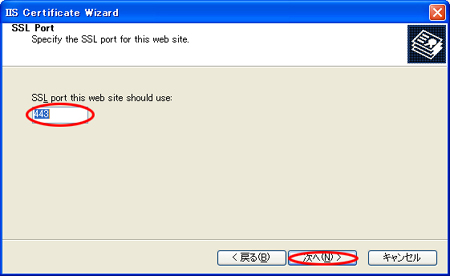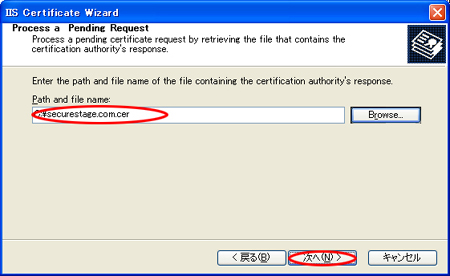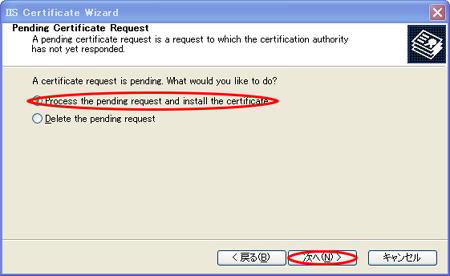 - [ 次へ ]をクリックして、さらに [ 保留中の要求を処理し、証明書をインストールする ] をクリックし、また [ 次へ ] をクリックしてください。サーバ証明書ファイルのパスを指定する画面が表示されます。