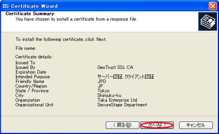 - 証明書ファイルを指定して [ 次へ] をクリックしてください。証明書の概要情報が表示されますので、それをご確認後、 [ 次へ ] をクリックし、インストールウィザードを完了します。