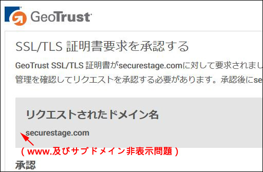 現在、ジオトラストプラン1、2及びRapidSSLプラン5、6の承認画面にて「サブドメイン」または「www.」が正しく表示していない不具合が発生しております。