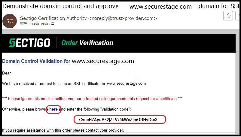 コモド(セクティゴ)からドメイン確認メールアドレス宛に、下記メールが送られてきます。