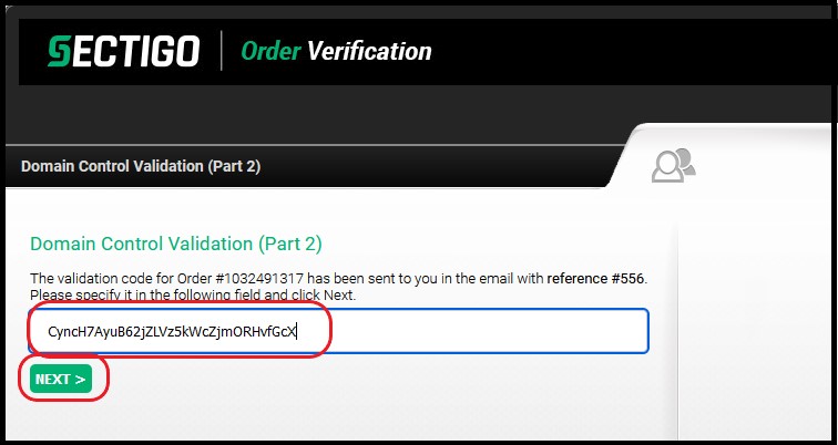 上記の「here」をクリックしましたら、コモド(セクティゴ)のサイトに繋がります。テキストボックスに上記のコードを入力して「NEXT」をクリックしてください。
