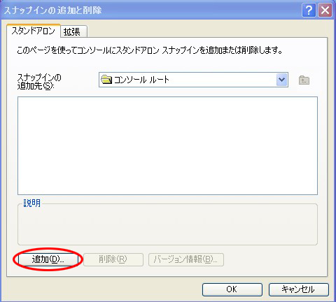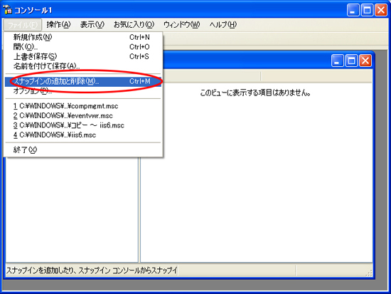 a) MMCを立ち上げてください。(サーバーの「スタート」をクリックしていただき、ファイル検索から「MMC」を入力してください。)b) ファイルメニューから「スナップインの追加と削除」を選択してください。